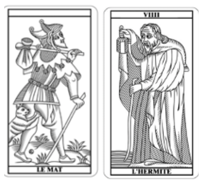 On retrouve le symbole du bâton rouge sur la carte du mat et sur celle de l’hermite.