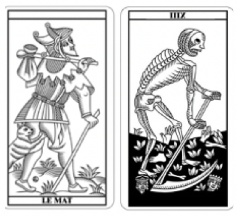 o Le bâton du Mat fait un angle de 30° par rapport au sol tout comme la faux du l’arcane sans nom (XIII)