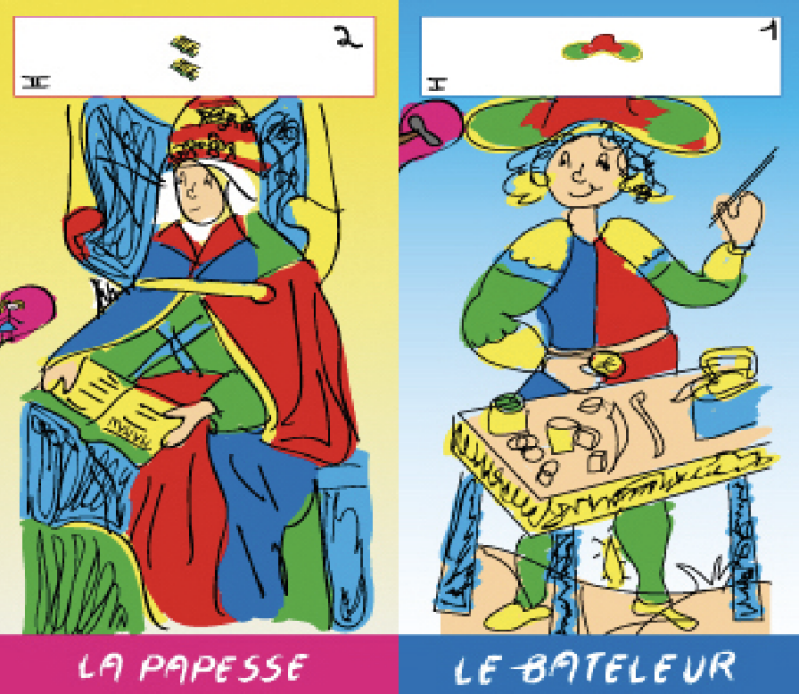 Côte à côte, le bateleur et la papesse sont deux personnages du tarot qui se tournent le dos. Leurs regards ne se croisent pas.